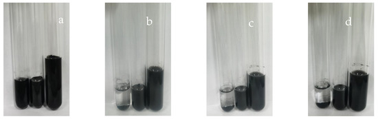 Figure 10. Settling of carbon black slurry in water (left bottle diluted 20 times, middle bottle diluted 80 times, and right bottle diluted 160 times): week 0 (a); week 1 (b); week 2 (c); and week 3 (d).