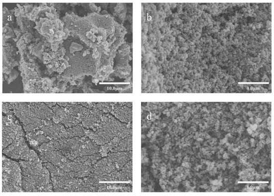 Figure 11 depicts high-magnification scanning electron microscope images of carbon black slurries without dispersant and with 37.5% dispersant added after drying. Upon examining Figure 11a,c, it is evident that the carbon black particles, in the absence of any added dispersant, coalesce together, forming dense clusters with larger-sized particles. From Figure 11b,d, it can be observed that individual carbon black particles typically have smaller diameters, while larger particles are often formed by aggregation of smaller ones. Therefore, after the addition of dispersants, the dispersants effectively inhibit the aggregation between carbon black particles, improving the dispersibility and stability of carbon black.