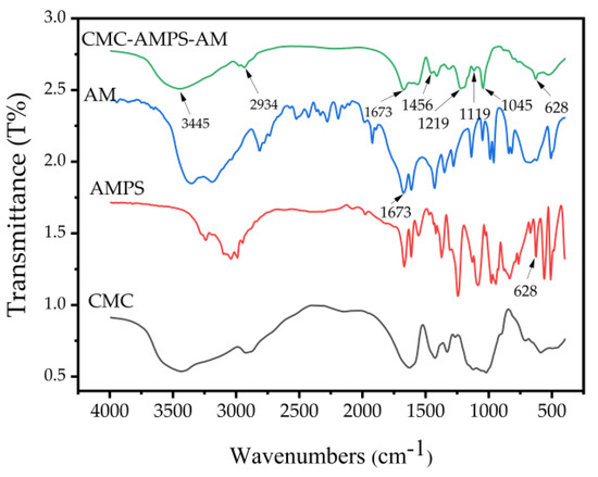 From the FTIR spectra shown in Figure 12, it can be observed that the −NH absorption peak of the secondary amide occurred at 2934 cm−1, whereas the C-S stretching vibration peak in AMPS appeared at 628 cm−1. The -SO3− in AMPS exhibited S-O bond asymmetry and S=O bond symmetry vibration absorption peaks near 1045 cm−1 and 1219 cm−1 [36]. The characteristic absorption peak at 3445 cm−1 is attributed to the -NH2 stretching vibration in AM. Furthermore, the characteristic peaks at 1673 cm−1 and 1119 cm−1 are related to the stretching vibration of the carbonyl C=O and C-N in the amide group of AM [37]. The deformation of methylene resulted in the generation of the characteristic absorption peak at 1455 cm−1. Through the FTIR analysis, it can be concluded that AMPS and acrylamide have been successfully grafted onto the cellulose skeleton.