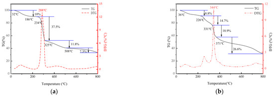 TG-DTG curves illustrate the weight loss of CMC and CMC-AMPS-AM, as shown in Figure 13. For CMC (Figure 13a), it is discernible that before the temperature reaches 32 °C–234 °C, there is a relatively insignificant weight loss of approximately 10%, which is attributed to the removal of adsorbed water on the carboxymethyl cellulose surface. Between 234 °C and 325 °C, there is a prominent weight loss of about 37.5%, stemming from the rupture and decay of C=O, C-O-C, and -OH bonds. Notably, the thermal degradation of cellulose attains a maximum when the temperature peaks at 289 °C, primarily due to a substantial number of C–C bond ruptures, leading to a vast mass reduction in cellulose. Throughout the entire process, spanning from 32 °C to 800 °C, the overall weight loss accounts for approximately 66.6% of the mass.