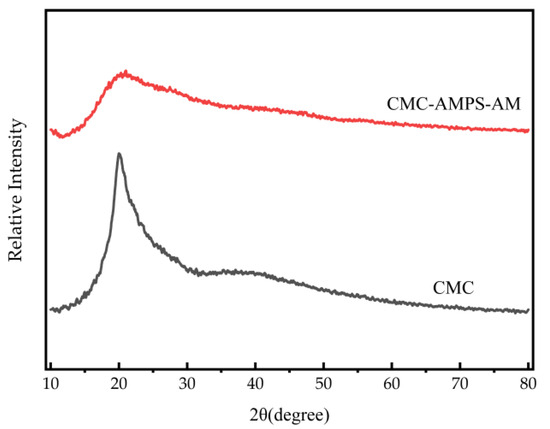 XRD results for CMC and CMC-AMPS-AM samples are shown in Figure 14, where it can be observed that in the grafting of AMPS, AM could impact the chemical reaction and molecular structure, subsequently causing deviations in the crystal structure, diminished grain size, and defects in the cellulose crystals. As a result of the decreased grain size and crystallinity, the peaks in the XRD pattern became broader, with a rounded shape and lower intensity.