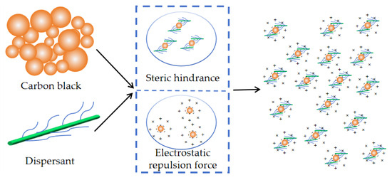 Carbon black is a dark powder, usually produced from heavy oil in petroleum refineries, coal, natural gas, and biomass under specific conditions. The composition of carbon black consists of discrete, nearly spherical particles, with the size of each particle varying based on the production method, often reaching the nanometer and sub-nanometer range [1]. Carbon black possesses excellent rubber reinforcement properties. Additionally, it is highly conductive and has anti-static properties. It is also used as a coloring agent and exhibits ultraviolet absorption. Due to these versatile properties, it is extensively utilized in various industries including printing and dyeing, and the production of paint, ink, rubber, plastic, foam, ceramics, silicone, leather, and cement building materials [2,3,4,5,6,7]. Even though carbon black is used in a variety of applications, it possesses a large specific surface area and exudes high surface free energy, which results in a high propensity for cluster formation and poor dispersion, making it challenging to uniformly disperse the particles within a matrix or substrate [8,9]. The technology for dispersing carbon black is pivotal for enabling practical applications of carbon black materials. Techniques such as vigorous agitation, ultrasonic treatment, and other dispersion methods have been proposed, but the dispersion of carbon black often falls short of expectations, leading to particle clumping and sedimentation [10]. Consequently, enhancing the dispersion performance of carbon black has become the focal point in this field.
