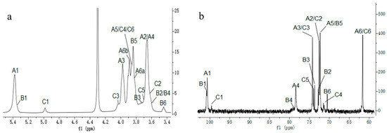 For residue B and C, the chemical shift assignments of 1Hand 13C signals were determined in the same way as residue A. According to previous reports [43,44,45] and the results of methylation analysis, residue B was identified as a 4,6-linked α-D-Glcp, while residue C was designated as a terminal-linked α-D-Glcp. A summary of the 1H and 13C NMR spectral assignments for all residues can be found in Table 2.