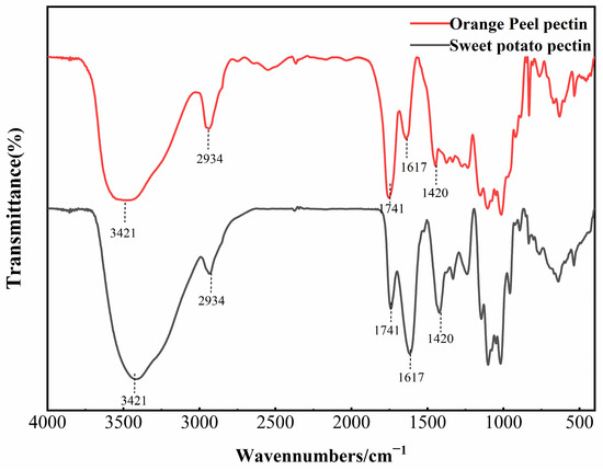 Infrared spectroscopy is typically used to identify the main functional groups in pectin structures. The FTIR spectrum of AMOP is shown in Figure 1, and it can be observed that its major absorption peaks were similar to those of citrus pectin. The strong and broad peak at 3421 cm−1 is caused by O–H stretching vibrations. The peak at around 2934 cm−1 corresponds to the absorption of the stretching and the stretching vibrations of C–H groups (CH, CH2 and CH3) in pectin [27].The peak at 1741 cm−1 corresponds to the stretching vibration of the carbonyl group in the methyl-esterified carboxyl groups [28]. Meanwhile, the peaks at 1617 cm−1 and 1420 cm−1 are attributed to the asymmetric and symmetric stretching vibrations of free carboxyl groups, respectively, confirming the presence of uronic acids [29]. The region from 800 to 1300 cm−1 is known as the “fingerprint region” of polysaccharide FTIR spectra, where the absorption peaks are dense and highly overlapping, reflecting the types and linkage modes of sugar residues [30]. Peaks in the range of 1000–1200 cm−1 correspond to the skeletal vibrations of C–O and C–C bonds in glycosidic linkages and pyranose rings, which are characteristics of polysaccharides [31]. The ratio of the peak area at 1741 cm−1 to the sum of the peak areas at 1617 cm−1 and 1741 cm−1 can reflect the degree of pectin esterification [32]. In commercial citrus pectin, the peak area at 1741 cm−1 is greater than that at 1617 cm−1, which is characteristic of highly esterified pectin. However, in the case of AMOP, the peak area at 1741 cm−1 was significantly lower than that at 1617 cm−1. The DE of AMOP calculated from the peak areas was 13.79%, which is close to the value determined via titration, further confirming that AMOP is a low-ester pectin.