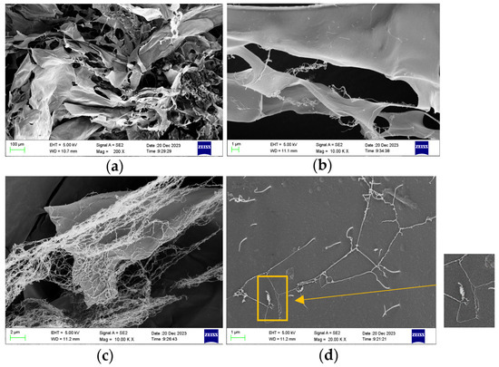 Scanning electron microscopy (SEM) image of ammonium oxalate-extracted purified sweet potato pectin (AMOP). (a) Magnification 200, (b) magnification 10,000, (c) magnification 10,000, and (d) magnification 20,000.