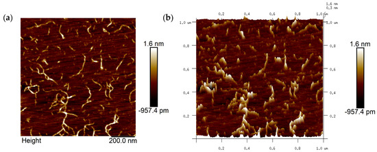 AFM can be used to collect microtopographic information about the surfaces of objects and is an important tool for studying the conformation of pectin polysaccharide molecules. The image of the sample obtained under AFM after dropping 0.5 µg/mL of AMOP solution onto a mica sheet is shown in Figure 3. The image shows pectin molecules in a fibrous form in a dilute solution, and some branching-like structures can be observed. From the analysis of their length and height, these fibers were considered aggregates or supramolecular assemblies of multiple pectin molecules, formed either via main chain branching or molecular aggregation, as the length of the neutral sugar side chains relative to the pectin molecules can be neglected.