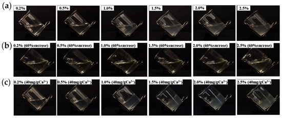Effects of the ammonium oxalate-extracted purified sweet potato pectin (AMOP) concentration, Ca2⁺ addition, and sucrose addition on the gelation of sweet potato pectin. (a) Gel formation diagram at 0.2–0.5% pectin concentration, (b) 0.2–0.5% pectin concentration with sucrose gel formation, and (c) gel formation with the addition of Ca2+ at 0.2–0.5% pectin concentration.