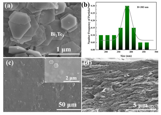 SEM images of Bi2Te3 nanosheets with 1g PVP (a); Particle size distribution statistics of Bi2Te3 nanosheets (b); Surface and cross-section of PEDOT@Bi2Te3 composited film (c,d).