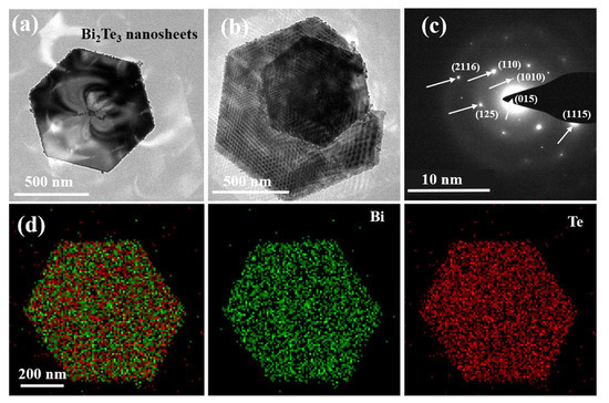 Transmission electron microscopy (TEM) was employed to examine the morphology and crystal structure of Bi2Te3 nanosheets. As illustrated in Figure 4a,b, TEM images of the Bi2Te3 nanosheet powder unveil the synthesis of well-defined hexagonal-shaped nanosheets featuring a side length of approximately 383 nm. Although the size of Bi2Te3 nanosheets exhibits some non-uniformity and lacks a distinct preferred orientation, the atomic structure remains evident. The electron diffraction pattern (Figure 4c) attests to the single-crystalline nature of the synthesized nanosheets. In Figure 4d, EDS analysis reveals a uniform distribution of Te and Bi elements, further confirming the sheet-like material as Bi2Te3 nanosheets. The introduction of PVP in this method plays a pivotal role. In this reaction, Te undergoes preferential reduction in ethylene glycol. The high electronegativity of O and N in polyvinylpyrrolidone imparts strong coordination capabilities. Through electrostatic forces, O and N interact with Te atoms, therefore impeding the overly rapid combination of TeO32−. This inhibition enhances the likelihood of subsequent reactions, particularly the combination of Te and Bi atoms. Due to the substantial binding force between Te and Bi atoms, the growth rate within the crystal layers surpasses that along the c-axis. This phenomenon leads to the formation of well-shaped and smooth-surfaced nanosheets.