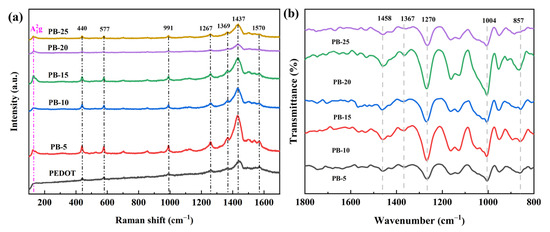 Raman spectra (a) and FTIR spectra (b) of a series of PEDOT@Bi2Te3 films.