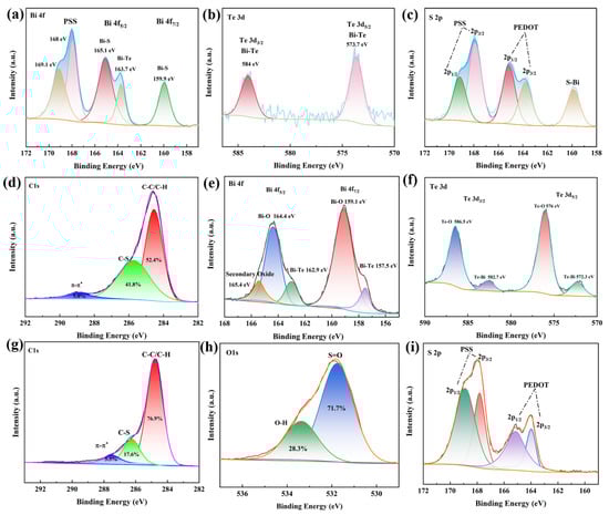 (a–d) Gaussian fitting spectra of Bi 4f, Te 3d, S 2p and C 1s for PB-10 (e,f) Bi 4f and Te 3d of Bi2Te3; (g–i) C 1s, O1s, and S 2p of PEDOT.