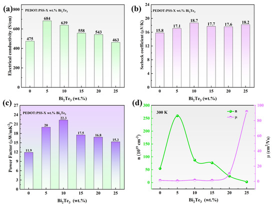 The effective and reasonable filling of inorganic fillers in PEDOT is aimed to enhance the Seebeck coefficient of the film. As depicted in Figure 8b, with the increase in the mass ratio of Bi2Te3 nanosheets, the Seebeck coefficient of the film increases by 19%. The PEDOT film exhibited a Seebeck coefficient of only 15.8 μV/K, while at a mass fraction of 10 wt.% of Bi2Te3 nanosheets, the Seebeck coefficient reached 18.7 μV/K at 300 K. The Seebeck coefficient exhibits an inverse proportionality to the carrier concentration, with the highest carrier concentration corresponding to the lowest Seebeck coefficient. As the Bi2Te3 filler increases, PEDOT carrier transport is hindered, leading to carrier concentration being decreased. Subsequently, there was a decrease in conductivity. The Seebeck coefficient initially increases and then decreases. The construction of two-dimensional binary composite films effectively enhanced the thermoelectric properties, and the Seebeck coefficient and conductivity were positively correlated with the power factor of the composite films. Carrier concentration is positively correlated with conductivity and negatively correlated with the Seebeck coefficient, so the relationship between carrier concentration and conductivity and the Seebeck coefficient is illustrated in Table 1: