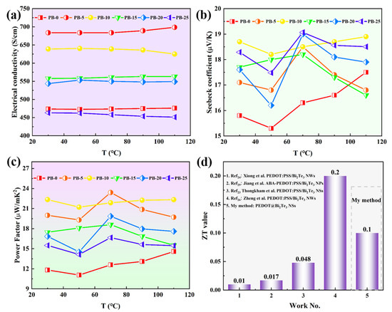 The authors should discuss the results and how they can be interpreted from the perspective of previous studies and the working hypotheses. The findings and their implications should be discussed in the broadest context possible. Future research directions may also be highlighted. The free-standing films of PEDOT@Bi2Te3 prepared by the tape-casting method were subjected to electrical property and Seebeck coefficient measurements using a thermoelectric performance testing system. The conductivity and Seebeck coefficient were determined as the mean of three measurements taken from different samples. As shown in Figure 8, the study systematically investigated the influence of the doping ratio of Bi2Te3 nanosheets on the thermoelectric performance of flexible films. It is observed that the conductivity of the free-standing composite film prepared by casting is higher than that of the film with only DMSO added (Figure 8a). The conductivity reaches its maximum value of 684 S/cm−1 when the mass fraction of Bi2Te3 nanosheets is 5 wt.%. As the mass fraction of Bi2Te3 nanosheets increases, the conductivity of the composite film gradually decreases, in accordance with the results presented by Wang et al. [26]. The addition of Bi2Te3 elevated the carrier concentration to five times the original (Figure 8d and the conductivity of the films increased abruptly, which was related to the narrowing of the forbidden bandwidth of the composites. While the gradual decrease in conductivity can be attributed to the increase of inorganic fillers with weak electrical conductivity, the carriers on the PEDOT molecular chains are hindered from transporting between the polymer chains, making the carrier transport more difficult, and the charge transfer efficiency is reduced making the conductivity of the PB-25 film severely reduced and lower compared to the PEDOT film.
