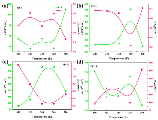 According to classical charge transport theory, the mobility of carriers is inversely proportional to temperature, showing a linear trend, decreasing as T increases in a T−3/2 fashion. The relationship between carrier mobility and concentration in the original film with temperature is shown in Figure 11a, consistent with transport theory. PEDOT@Bi2Te3 composite film prepared by organic-inorganic hybridization, hole mobility decreases and then increases with temperature. PB-5 and PB-10 exhibit nonlinear changes, while PB-25 has a lower carrier concentration and weaker conductivity but a continuously increasing mobility trend. This is because an excessive introduction of weakly conductive Bi2Te3 nanosheets reduces the effective charge mass inside the film due to carrier scattering, resulting in enhanced carrier mobility and reduced concentration, consequently leading to decreased conductivity in PB-25. However, an appropriate amount of Bi2Te3 nanosheet doping reduces the energy barrier, resulting in an elevated carrier concentration [11]. When the working temperature rises to 360 K, mobility decreases, low-energy carriers undergo phonon scattering, and the charge mass decreases, while high-energy carriers persist in transporting within the composite film, causing an increase in carrier concentration. This phenomenon is ascribed to the interface energy-filtering effect in the composite films.