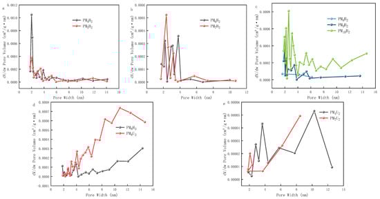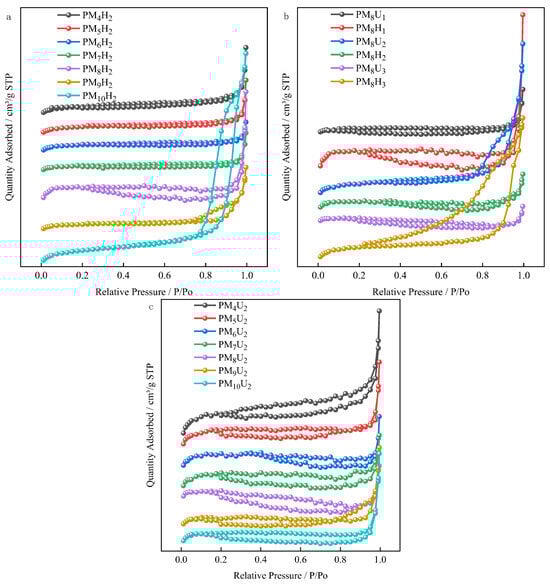 As shown in Figure 4a,b, the hysteresis loops of the PAA hydrogels formed using heat curing are small or almost absent, which means that the pore structure in the hydrogel is irregular, dispersed, or has small pore sizes. As shown in Figure 5a–c, more small pore sizes were formed. The increase in the cross-linking agent mass ratio led to an increase in the pore size and an uneven pore size distribution. Smaller hysteresis loops imply the poor connectivity of the pores or a narrower pore size distribution, which may have some effect on the adsorption and transport properties of the substances [15,16]. As shown in Figure 4, both the PAA hydrogels cured by heat and UV show representative III curves, which essentially have hysteresis loops and upward tailing loops. This observation indicates that the pore structure in the hydrogel consists of macropores or macropores coexist with mesopores. In this case, the large size of the pores facilitates the movement of nitrogen molecules to the pores, thus exhibiting unrestricted adsorption [17]. Non-restricted adsorption refers to the situation where the interaction between the adsorbent and the adsorbate during adsorption is not restricted by the size or shape of the pores [18]. Figure 4 shows that the isotherms continue to increase at higher relative pressures (close to 1), indicating that the adsorbent can still enter the pores or adsorb on the surface of the adsorbent even at higher pressures. The PAA hydrogel serves as an adsorbent owing to its numerous carboxy functional groups, which can interact with a variety of ions or molecules, thus achieving the adsorption of specific substances. As shown in Figure 4b,c, the PAA hydrogels formed through UV curing have large hysteresis loops, which implies the presence of regular, uniform, and interconnected mesoporous structures in the hydrogels. Large hysteresis loops usually indicate that these mesopores have high connectivity and large pore sizes, which are favorable for the transport and adsorption of substances in them [19]. As shown in Figure 5d,e, the pore size of the UV-cured hydrogels also increases with the cross-linking agent mass ratio. As shown in Figure 4b–c, the hysteresis loop conforms to the H3-type hysteresis loop line, indicating that the interior of such hydrogels mainly comprises pores of flat slit-like, crack-like, or wedge-shaped structures, which are also seen in aggregates of a laminar structure. These structures may be attributed to the stacking of lamellar particles or the formation of non-rigid aggregates. The large hysteresis loop of PM8H3 in Figure 4b indicates that the hydrogel is characterized by the presence of large pores, as shown in Figure 5d. Therefore, the occurrence of unrestricted adsorption makes the adsorbent less selective to the target substance, resulting in a lower adsorption capacity.