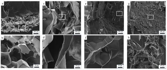 SEM images of PAA hydrogels. ((a) PM9U2; (b) partial enlargement of (a); (c) PM9H2; (d) partial enlargement of (c); (e) PM8U2; (f) partial enlargement of (e); (g) PM6H2; (h) local enlargement of (g)).