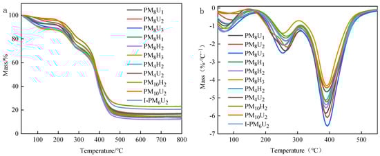 Thermogravimetric analysis (TG) and differential thermogravimetric analysis (DTG) are methods for assessing the thermal stability of materials. It involves measuring the mass of a sample as a function of the experimental temperature under controlled conditions and different atmospheres. Figure 7 shows that the thermal decomposition process of PAA hydrogels cured under different conditions is similar and can be divided into three stages. In the first stage, the weight loss of the hydrogel occurred at approximately 100 °C. In this stage, the weight loss of the sample caused by water evaporation was minimal, indicating that the hydrogel was physically stable and maintained its structural integrity at a certain temperature. As shown in Table 2, the temperature at which 10% mass loss occurred was 100–200 °C. In the second stage, the thermal decomposition process occurred at 200–400 °C, when the hydrogel underwent initial pyrolysis, which was mainly due to the incomplete cross-linking of the branched part of the hydrogel. As shown in Table 2, the temperature at which 50% mass loss occurred was 380–390 °C. In this stage, the mass loss caused by thermal degradation mainly originated from the main body of the cross-linked hydrogel. The maximum decomposition rate of the hydrogel appeared at 387.8 °C. The difference in the initial thermal degradation temperature of the PAA hydrogels produced at different cross-linking agent mass ratios was related to the curing method. Specifically, the initial thermal degradation temperature was higher for the thermally cured hydrogels. The amount of residual carbon in the PAA hydrogels cured under different conditions was slightly different, and the highest amount of carbon was observed in the hydrogels UV cured for 20 min and thermally cured for 4 h. The higher amount of carbon indicates that the hydrogel is more susceptible to thermal degradation. This also indicates that the hydrogel produces less gaseous matter at high temperatures. The carbon layer formed can cover the surface, providing protection that enhances the heat and ablation resistance [21,22,23]. During the polymerization process, the number of cross-linking points in the PAA hydrogel increased with the curing time, leading to an increase in the cross-linking density. The increase in the cross-link density restricted the movement of the polymer chains, thereby enhancing the interactions between the chain segments. However, a longer curing time can enhance interactions that can make the polymer chains more susceptible to breakage during thermal decomposition.