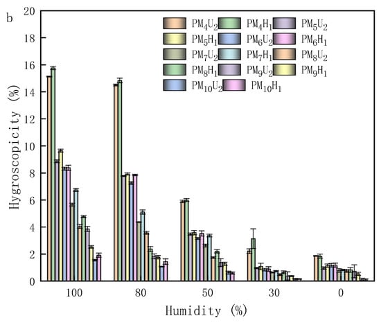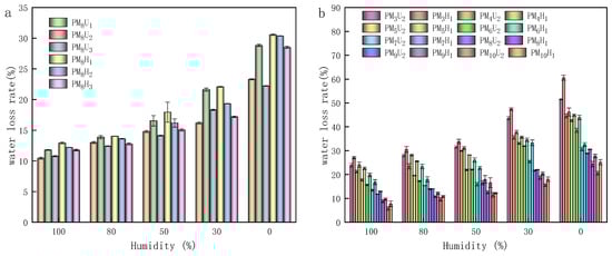 As shown in Figure 8, during the testing of the swelling properties of the PAA hydrogels, the PAA hydrogels reached the dynamic equilibrium of swelling at 60 h, and the amount of water uptake was stabilized. Figure 8a shows the dynamic equilibrium of the swelling of the UV-cured PAA hydrogels (10, 20, and 30 min) and the thermally cured PAA hydrogels (2, 4, and 6 h) at a cross-linking agent mass ratio of 3.85%. Figure 8b illustrates the equilibrium of swelling plots of the PAA hydrogels cured using UV for 20 min and thermal curing for 2 h at various cross-linking agent mass ratios. As shown in Figure 8a and Figure 9a, the highest swelling and water loss were obtained with UV curing for 20 min and thermal curing for 2 h. The swelling and water loss of the thermally cured hydrogel were slightly higher than those of the UV-cured hydrogel. This phenomenon indicates that the hydrogel has a higher capacity to absorb water molecules and a lower retention capacity to preserve water molecules under these two conditions. However, the increase in the curing time led to a decrease in the swelling degree and water loss rate of the hydrogels. As shown in Figure 8b and Figure 9b, the swelling degree and water loss of the PAA hydrogels significantly decreased with an increasing cross-linking agent mass ratio. This phenomenon could be attributed to the addition of cross-linking agents, which increased the cross-linking density of the polymer chains, thereby reducing the swelling property of the hydrogels. The PAA hydrogels with cross-linking agent mass ratios of 1.96% and 2.91% and that were heat-cured for 2 h exhibited an optimal swelling performance. As shown in Figure 9b, the water loss performance was strongly related to the air humidity. The maximum and minimum water losses of the PAA hydrogels were 27.1% and 5.7% at 100% air humidity, respectively. At 0% air humidity, the maximum and minimum water losses of the PAA hydrogels were 60.6% and 20.6%, respectively. As the air humidity decreased, the hydrogel water loss rate increased. At a constant air humidity, heat curing led to an increased water loss rate, whereas higher degrees of cross-linking decreased the water loss rate. Increasing the cross-linking agent mass ratio of the hydrogel helped to prevent it from losing water in the air environment. As shown in Figure 10a, the moisture absorption rate was the highest under the condition of heat curing for 2 h. However, compared with the other curing methods, the difference in the moisture absorption rate is approximately 1%. Therefore, the difference in the moisture absorption performance and curing method is insignificant. Moreover, the moisture absorption performance and air humidity have a certain relationship. When the air humidity was 100%, the moisture absorption rate was approximately 5%. As shown in Figure 10b, as the cross-linking agent mass ratio increases, the hydrogel moisture absorption performance significantly decreases. Therefore, reducing the cross-linking agent mass ratio decreased the cross-linking density of the hydrogel, which effectively enhanced its ability to absorb water in atmospheric conditions.