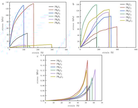 The mechanical tensile test results in Figure 11 and Table 3 reveal that PM8U2 has the greatest mechanical tensile strength, reaching 135 kPa, followed by PM10U2 and PM9U2, which were more than 120 kPa. This variation is because the mechanical tensile properties of the hydrogel are mainly related to the internal formation of the network structure; the more compact it is, the stronger its mechanical properties. PM5U2 had the largest elongation at break, which was more than 450%. As the degree of cross-linking decreases, the elongation at break increases, resulting in the lower rigidity and greater flexibility of the hydrogel. The mechanical compression test results in Figure 11b reveal that PM6U2 has the highest mechanical compression strength, at 0.16 MPa. This result shows that the mechanical properties of the polyacrylic acid hydrogel are enhanced as the degree of cross-linking increases. This phenomenon occurs because an increase in the cross-linking agent mass ratio increases the number of connection points between the polymer chains, making the gel more resistant to deformation when subjected to stretching. However, excessive cross-linking can lead to the over-structuring of the polymer chains, potentially reducing their performance. Similarly, an increase in cross-linking improves the mechanical compression properties of the hydrogels. More cross-linking points mean that the gel can better maintain its structural integrity when subjected to compression [24,25,26].