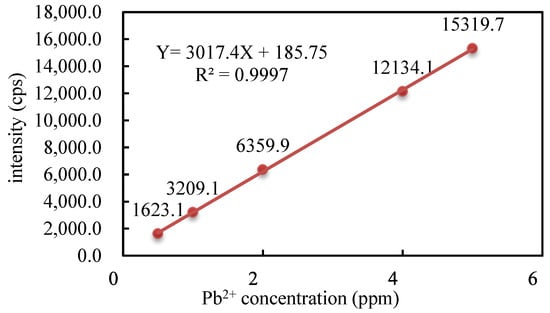 First, lead nitrate solutions of 0.50, 1.00, 2.00, 4.00, and 5.00 mg/L concentrations were prepared by diluting the original solution of 1000 mg/L. The adsorption values were measured using inductively coupled plasma emission spectrometry (ICP-OES), and a standard curve for Pb2+ was plotted. To prepare 1000 mL of Pb2+ at a concentration of 207.2 mg/L, 10 mL of Pb2+ was pipetted into a weighing flask containing 1.00 g of dry gel. The flask was uniformly shaken using a thermostatic water bath oscillator for 24 h at 25 °C and standard atmospheric pressure to allow the dry gel to adsorb Pb2+ in the weighing flask. The pre- and post-adsorption solutions were diluted 100 times, with their pH = 1. Experiments were performed using a 2% nitric acid solution for volume fixation. Subsequently, the adsorption values were measured using ICP-OES. The adsorption capacity was calculated using Equation (7):