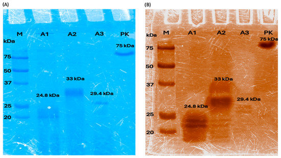 The clones containing each of the ANCUT genes were cultured as described above. The production of the enzymes of interest was monitored by performing a protein profile of the crude culture supernatant in SDS-PAGE gels, including a molecular weight marker. A zymogram was also performed to verify enzyme activity “in situ” (Figure 1A,B). As can be seen, the molecular masses detected for each of the recombinant enzymes correspond to those detected previously in the work group (ANCUT1, 24.8 kDa; ANCUT 2, 33 kDa; and ANCUT3, 29.4 kDa) [25,26] and to their predicted molecular masses according to the gene sequences. The same is true for proteinase K (75 kDa).