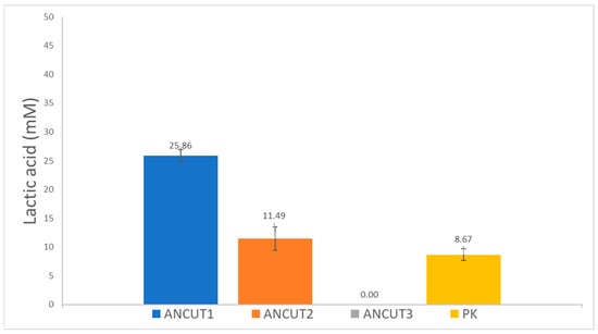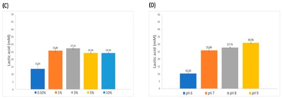 The best condition for each parameter was selected, and each was included in an integrated experiment using ANCUT1. They were as follows: enzyme concentration, 3% (genzyme gPLLA−1); PLLA, 425 μm particle size; 50 mM sodium phosphate; pH 9; 40 °C. As shown in Figure 4, the improved reaction conditions released 41.84 mM lactic acid, which represents a 62% increase compared to the initial experiments and a 483% increase compared to the lactic acid produced by PK.