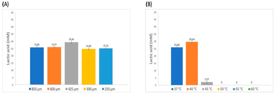 An initial effort was made to improve the results, considering the particle size, reaction temperature, pH, and enzyme levels. The particle size of 425 µm yielded the best result in terms of lactic acid release, and this result is significantly different from the other values. The effect of particle size is related to the area of contact between the enzyme and the substrate. The fact that the best value was found for the intermediate size might indicate that there is a compromise between the area reached by the enzyme and diffusion issues for the release of the product. This behavior might be related to that observed with enzyme concentration, as the intermediate level proved to be the level that yielded the highest results. High levels of enzyme might interfere with the mobility required to perform the degradation reaction.