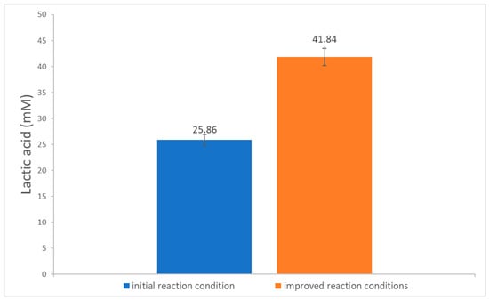 Released lactic acid after PLLA hydrolysis with initial conditions and improved reaction conditions for ANCUT1 3% at 40 °C, 50 mM sodium phosphate buffer, pH 9, 10 mg powder PLLA with 425 μm particle size, and 0.005% sodium azide. The results were obtained after 7 days of incubation.