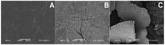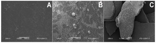 The PLLA powders degraded by the different enzymes, as well as the commercial package degraded with ANCUT1, were analyzed with SEM. As can be seen in the series of images, non-treated PLLA showed a homogeneous surface, which was smooth, without imperfections (Figure 5A), while those treated with ANCUT1 showed cracking (Figure 5B,C).