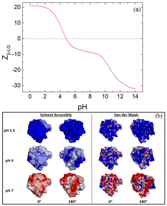 (a) Net charge of β-LG in relation to pH for its folded state and (b) electrostatic potential of β-LG at pH 1.5, 4 and 7 for the representations of solvent accessibility and van der Waals surface areas. In (b), the color scale is in the range between −5 kBT/e (red) and 5 kBT/e (blue) and the rotation of 180° is achieved on the y-axis of the protein molecule.