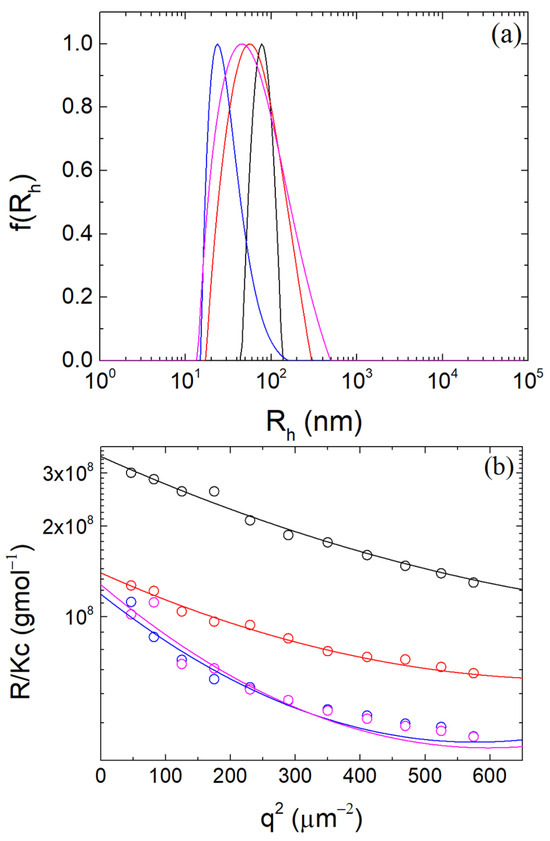 Samples of β-LG/CS complexes were prepared for mass ratios rm in the region of the optimum rm (i.e., 0.4, 0.8, 1.0 and 1.2). In Figure 2a, the sample with rm 0.4 seems to be the optimal mass ratio for this system, showing the narrowest, single peak of all the four samples, the largest value of Mw, as well as the smallest one for Rg in Figure 2b (Table S1). The mean hydrodynamic radius of the optimal rm was 79.1 ± 3.7 nm with a molecular mass of roughly (3.45 ± 0.52)×108 gmol−1 and a radius of gyration 86.0 ± 5.9 nm. The shape factor ρ was 1.09 ± 0.09, showing compatibility with the microgel morphology of 1.0–1.2 and close relation to the uniform spherical value of roughly 0.8 [50,61,62].