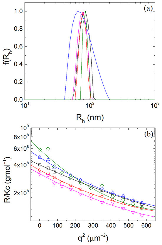 For static and dynamic light scattering (SLS and DLS) measurements, a classic ALV system (ALV GmbH, Hessen, Germany) was employed, executing an analysis via an ALV-CG-3 goniometer and an ALV-5000/EPP multi-tau digital correlator with a He-Ne laser (λ = 632.8 nm). In SLS, the time-averaged scattered intensity is reduced to the Rayleigh ratio [44,45]. The average apparent molecular mass and the form factor are connected by Equation (1)