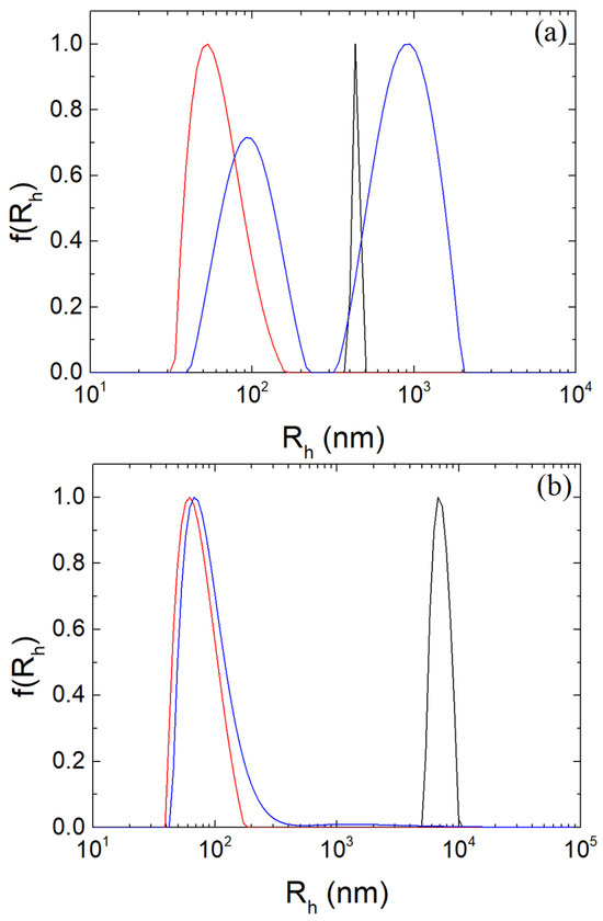 CONTIN analysis at 90° for β-LG/CS NPs at pH 1.5 (black), 4 (red) and 7 (blue): (a) before; (b) after TT.