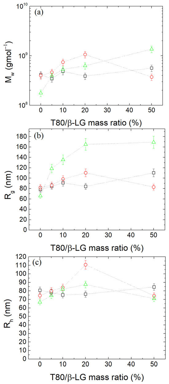 (a) Apparent molecular mass Mw, (b) radius of gyration Rg and (c) hydrodynamic radius Rh (CONTIN analysis at 90°) at pH 4 for β-LG/CS/T80 NPs before (black) and after (red-T80 added after, green-T80 added before) thermal treatment.