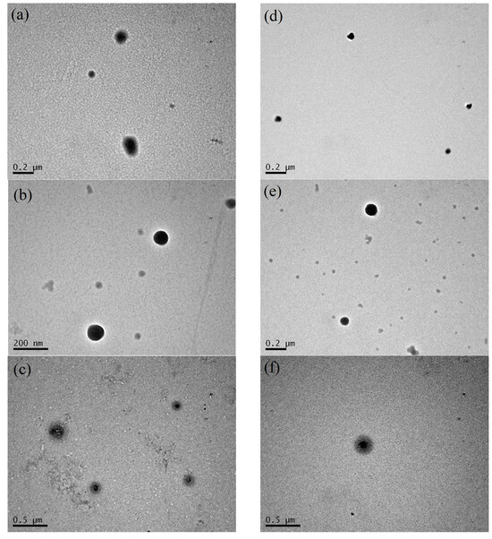 TEM images from β-LG/CS NPs with rm 0.4 at 0.2 mg/mL β-LG: (a) before TT at pH 4; (b) after TT at pH 4; (c) after TT at pH 7. TEM images from β-LG/CS/T80 NPs at 0.2 mg/mL β-LG: (d) before TT at pH 4; (e) after TT at pH 4; (f) after TT at pH 7.