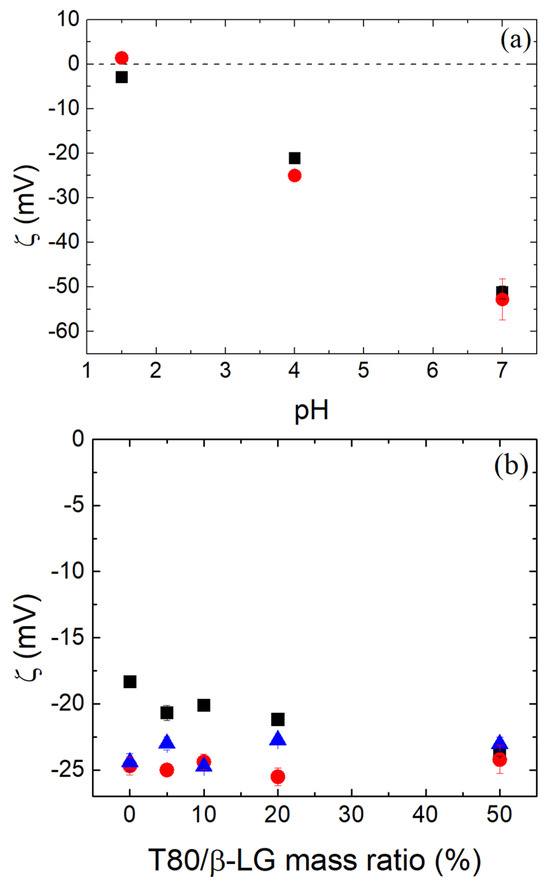 Zeta potential of β-LG/CS NPs (a) in relation to pH values before (black squares) and after (red circles) TT and (b) with the addition of different quantities of T80 at pH 4 before (black) and after TT (red circles, T80 added after TT; blue triangles, T80 added before TT).