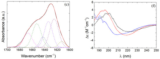 For the evaluation of the secondary structure of the deconvolution of the amide I group from 1600 to 1700 cm−1, a code written in MATLAB for the nonlinear least-squares method was used, which determines the superposition of Gaussian peaks. The general formula, , consists of the absolute weight , the standard deviation and the position of each Gassian peak. Initial conditions for each of the three latter parameters were selected according to the experimental data of the FTIR spectra to assist the convergence of the algorithm. A single Gaussian peak or a pair of two is attributed to one secondary structure element. The percentage of each secondary structure element was computed by the relative weight of every Gaussian peak [50,55].