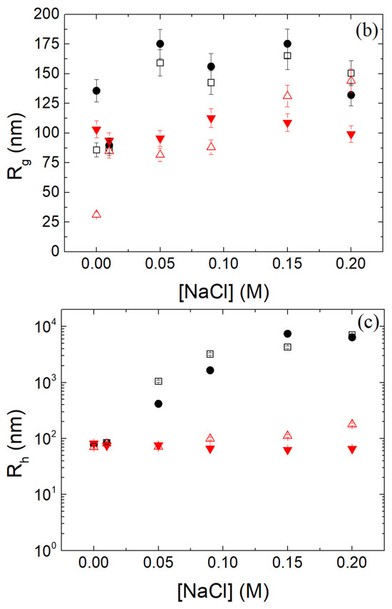 (a) Molecular mass Mw, (b) radius of gyration Rg and (c) hydrodynamic radius Rh (CONTIN 90°) in relation to NaCl concentration for thermally treated β-LG/CS NPs with (filled circles and reverse triangles) and without (unfilled squares and triangles) T80 at pH 4 (black) and 7 (red).