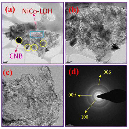 The NiCo-LDH/CNB composite’s detailed morphological characteristics were analyzed using Transmission Electron Microscopy (TEM). This analysis revealed the presence of hierarchical nanocages on the CNB, as shown in Figure 4a–d. These nanocages are easily distinguishable as they are attached to the CNB, featuring interlinked petals at the base and the nanocages themselves at the top. This structural formation likely results from the nucleation process, where ions nucleate on the CNB surface and subsequently grow into spherical shapes over time. The ion-exchange reaction that follows leads to the development of small petals and nanocages. This hierarchical structure is particularly advantageous as it provides an extensive active surface area, enhancing the material’s ability to interact with the electrolyte and store significant amounts of electrical energy, making it highly suitable for energy storage applications. Further meticulous examination of the nanocages’ edges reveals that their shells are composed of interconnected nanosheets with ultrathin thicknesses. Despite these intricate details, the primary shape of the NiCo-LDH remains largely unchanged, aligning with the observations from scanning electron microscopy (SEM). Additionally, the Selected Area Electron Diffraction (SAED) pattern in Figure 4d confirms the presence of distinct phases of bimetallic oxides, further validating the composite’s structural integrity and composition.