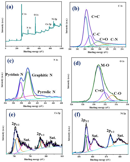 An in-depth analysis using elemental mapping techniques (illustrated in Figure 3a–f) confirmed the successful integration of various elements within the NiCo-LDH/CNB composite. Carbon (C) and nitrogen (N) signatures originated from the porous carbon substrate, while cobalt (Co) and nickel (Ni) stemmed from the bimetallic inclusions. Oxygen (O) was attributed to both the porous carbon (CNB) and the bimetallic oxides. Importantly, these elements were uniformly dispersed throughout the composite, as shown by the individual mapping images. This homogenous distribution not only guarantees the structural integrity and consistent material properties but also signifies the preservation of the spherical core structure during synthesis, indicative of remarkable material stability. This even distribution of elements is paramount for the composite’s performance, as it implies efficient interaction and synergy between its various components—a key factor for potential applications in catalysis and electronics [27,28,29].