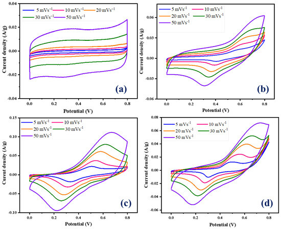 CV graphs of (a) CNB; (b) NiCo-LDH/CNB (25%); (c) NiCo-LDH/CNB (50%); and (d) NiCo-LDH/CNB (75%).