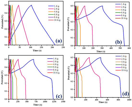 GCD graphs of (a) CNB; (b) NiCo-LDH/CNB (25%); (c) NiCo-LDH/CNB (50%); and (d) NiCo-LDH/CNB (75%).
