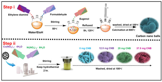 Schematic representation showing the formation of CNB and NiCo-LDH/CNB.