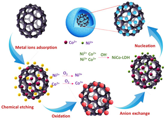 - Wang, P.; Li, Y.; Li, S.; Liao, X.; Sun, S. Water-promoted zeolitic imidazolate framework-67 transformation to Ni−Co layered double hydroxide hollow microsphere for supercapacitor electrode material. J. Mater. Sci. Mater. Electron. 2017, 28, 9221–9227. [Google Scholar] [CrossRef]