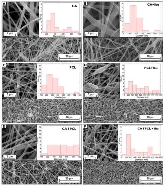SEM images and respective distribution of diameters of CA without (A) and with (B) Ibu, PCL without (C) and with (D) Ibu, and CAǀPCL membranes without (E) and with (F) Ibu.
