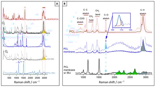 Raman spectra of (A) raw materials used to produce CA and PCL membranes and of membranes after ibuprofen release tests (CA + Ibu and PCL + Ibu); (B) PCL membrane and PCL membrane with Ibu compared to PCL powder. The spectra also show a magnification of the lowest-intensity peaks (lighter line).