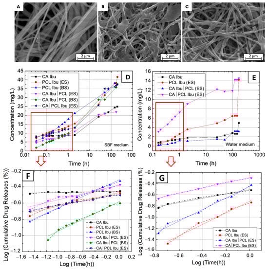 SEM images of samples following 190 h of drug release: (A) CA Ibu; (B) PCL Ibu; (C) CA|PCL Ibu. Drug release of various membranes versus time: (D) in SBF medium; (E) in water medium. Fitting experimental data following 1 h of drug release to the Korsmeyer–Peppas model: (F) in SBF medium; (G) in water medium.