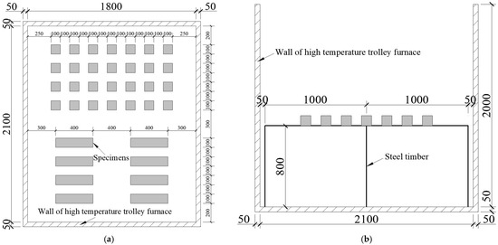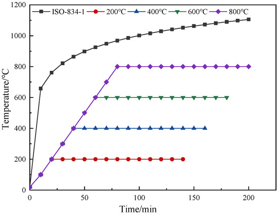 Before the high-temperature test, all the samples were weighed and measured first, and then, the samples were heated in the high-temperature furnace; the heating speed was set to 10 °C/minute. When the specified heating temperature (200 °C, 400 °C, 600 °C, 800 °C) was reached, the temperature was maintained for 120 min to ensure that the temperature in the core area of the samples could also reach the preset temperature value. The standard and actual temperature rising curves are shown in Figure 1. In order to better ensure the uniformity of the heating of the specimens, only one layer of specimen was placed in the high-temperature furnace for each test, and the arrangement of the specimens is shown in Figure 2.