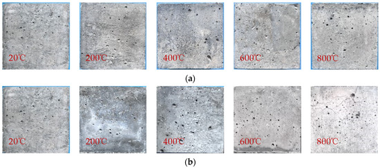 It could be observed that the fiber content had minimal impact on the color of the specimens. Therefore, this paper focuses on observing the specimens with fiber content of 0.2%, and the color changes of the specimens after the treatment of immersion cooling and naturally cooling were compared, as shown in Figure 4. At 20 °C and 200 °C, the color of the specimens under both cooling methods was bluish gray. When the temperature reached 400 °C, the surface color of the specimens cooled by natural cooling became slightly lighter, while for the specimens cooled by immersion cooling, the color became light yellow due to the reaction of internal impurities with water; moreover, fine cracks could be observed on the surface of the specimen. At 600 °C, Ca(OH)2 in the HSC would be dehydrated and decomposed, and the main components after natural cooling were CaO, SiO2, etc.; thus, the colors were gray and white. However, the surface color of the specimens cooled by immersion cooling turned to a dark brown-yellow color due to the rust reaction of the composition in the HSC. At 800 °C, the gel inside the concrete underwent nearly complete transformation, and the surface of the specimens appeared white under the two cooling methods. At the same time, the cracks gradually developed and the width of the cracks increased.