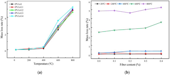 Figure 5a gives the change of the mass loss rate of the samples with different temperatures under the natural cooling condition. It is evident from the figure that the mass loss rate keeps increasing as the temperature increases. At 400 °C, the mass loss rates of specimens with a fiber content of 0% to 4% were 0.132%, 0.200%, 0.335%, 0.332%, and 0.336%, respectively. When the temperature increased to 600 °C, the mass loss rates were 2.463%, 2.692%, 2.808%, 2.935%, and 3.589%, respectively. In the temperature range of 400 °C~600 °C, the mass loss rate for each fiber content increased by 17.6 times, 12.46 times, 7.38 times, 7.84 times, and 9.68 times, respectively. This phenomenon may be due to the fact that the temperature of 400 °C has exceeded the thermal decomposition temperature of the PVA fiber; thus, the rapid decomposition of the fiber and the release of volatile gas will occur [28]. Simultaneously, the evaporation rate of free water and bound water in concrete will be faster, and the hydration products of cement will be dehydrated and decomposed. Due to the release of water and other volatile substances, the mass of the concrete specimens decreased [29].